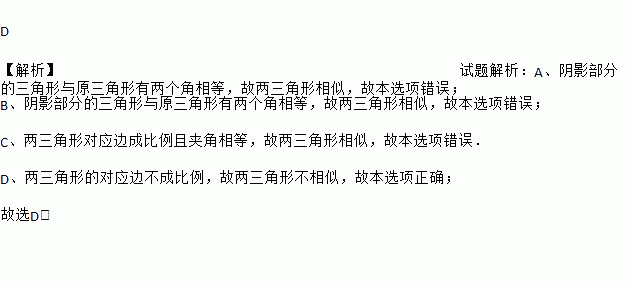 如图,△ABC中,∠A=70°,AB=4,AC= 6,将△ABC沿图中的虚线剪开,则剪下的阴影三角形与原三角形不相似的是( )