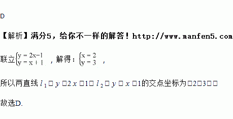 两直线 l 1 : y =2 x -1, l 2 : y = x +1的交点坐标为( ).