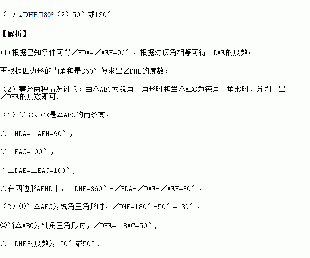 (2)若△ABC中∠BAC=50°,直接写出∠DHE的度数是____.