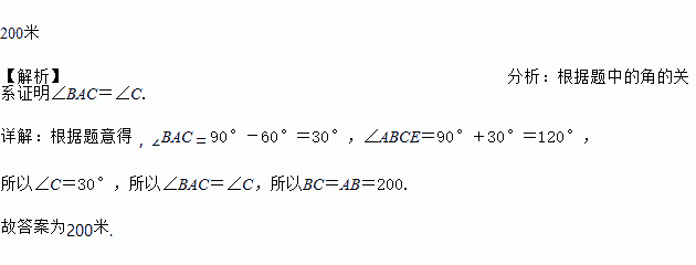 小明从A处出发,要到北偏东方向的处,他先沿正东方向走了200米到达B处,再沿北偏东方向走恰能到达目的地处. 则、两地的距离为 ________