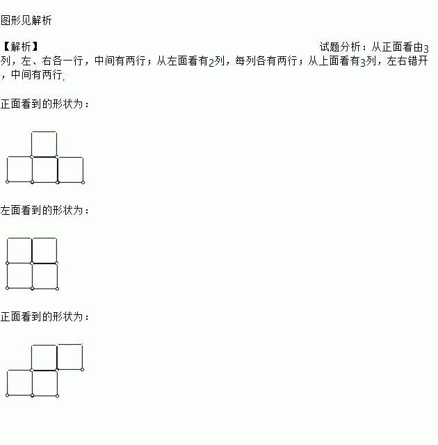 如图是由6个正方体组成的几何体,请分别画出从正面、左面、上面看到的这个几何体的形状图。
