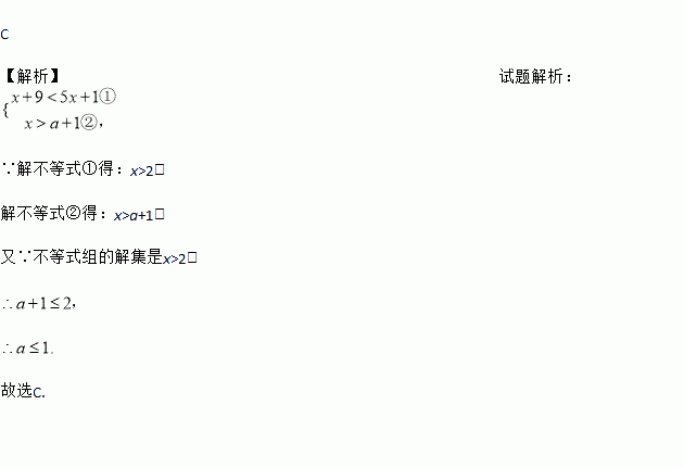 C 【解析】试题解析: ∵解不等式①得:x>2, 解不等式②得:x>a+1, 又∵不等式组的解集是x>2, 故选C.
