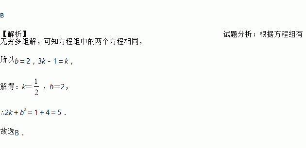 B 【解析】试题分析:根据方程组有无穷多组解,可知方程组中的两个方程相同, 所以b=2,3k-1=k, 解得:k=,b=2, ∴2k+b2=1+4=5. 故选B.