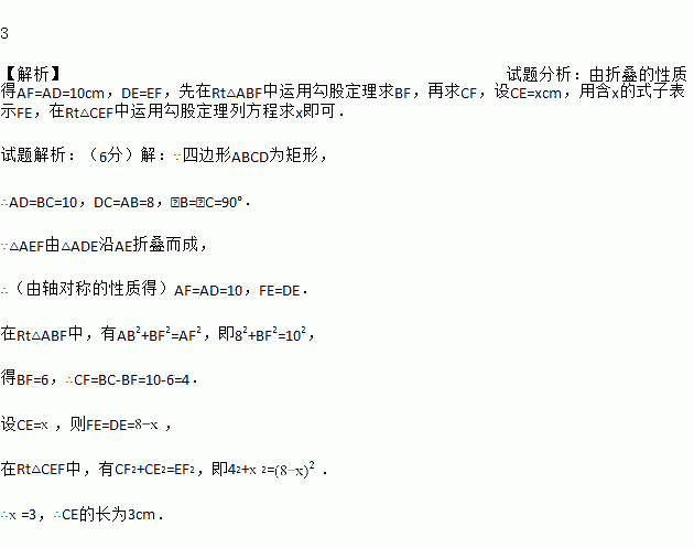 如图,矩形纸片ABCD进行折纸,已知该纸片宽AB为8cm,长BC为10cm,当沿AE折叠时,顶点D落在BC边上的点F处,试求CE的长.