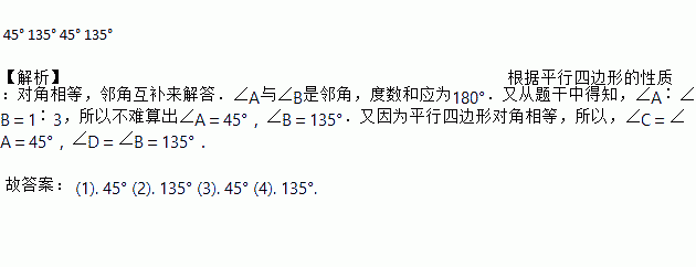 平行四边形ABCD中,若∠A∶∠B=1∶3,那么∠A=________,∠B=________,∠C=________,∠D=________.