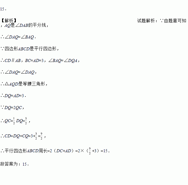 MN的长为半径作弧,两弧相交于点P;③作AP射线,交边CD于点Q,若DQ=2QC,BC=3,则平行四边形ABCD周长为________.