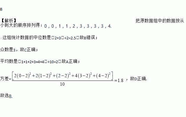 A. 平均数是2 B. 中位数是3 C. 众数是3 D. 方差是1.8
