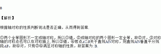 下列说法:①全等的两个图形一定成轴对称;②成轴对称的两个图形一定全等③轴对称图形的对称点一定在对称轴的两侧;④若点A、B关于直线MN对称,则直线MN垂直平分线段AB.正确的有 ( )