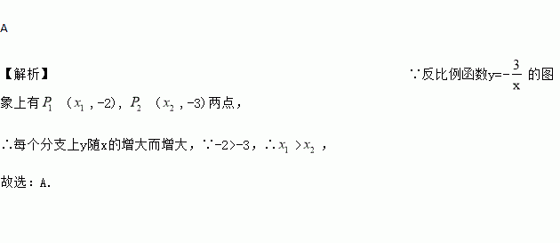 A 【解析】∵反比例函数y=?的图象上有 (,?2), (,?3)两点, ∴每个分支上y随x的增大而增大,∵?2>?3,∴>, 故选:A.