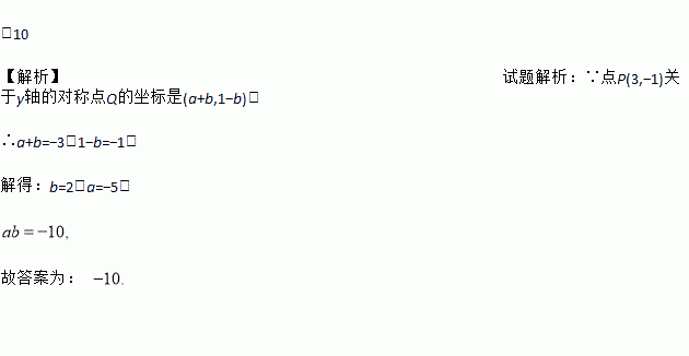 -10 【解析】试题解析:∵点P(3,?1)关于y轴的对称点Q的坐标是(a+b,1?b), ∴a+b=?3,1?b=?1, 解得:b=2,a=?5, 故答案为: