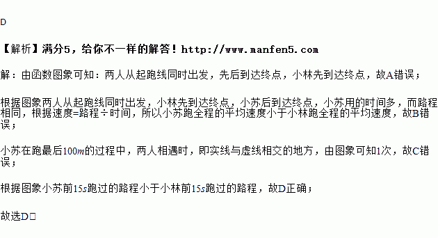 D. 小苏前15s跑过的路程小于小林前15s跑过的路程