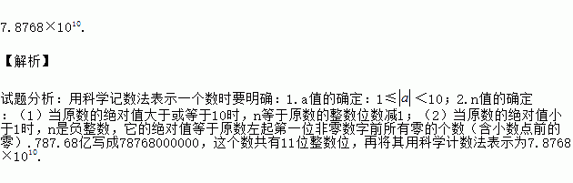 7.8768×1010. 【解析】 试题分析:用科学记数法表示一个数时要明确:1.a值的确定:1≤<10;2.n值的确定:(1)当原数的绝对值大于或等于10时,n等于原数的整数位数减1;(2)当原数的绝对值小于1时,n是负整数,它的绝对值等于原数左起第一位非零数字前所有零的个数(含小数点前的零).787.68亿写成78768000000,这个数共有11位整数位,再将其用科学计数法表示为...