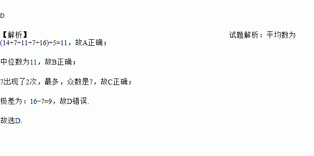 已知一组数据:14,7,11,7,16,下列说法不正确的是( )