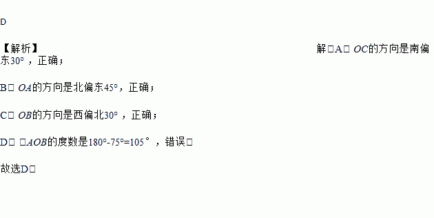 D 【解析】解:A. OC的方向是南偏东30° ,正确; B. OA的方向是北偏东45°,正确; C. OB的方向是西偏北30° ,正确; D. ∠AOB的度数是180°-75°=105°,错误. 故选D.