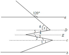 分析:作C∥b,E∥b,D∥b,根据两直线平行内错角相等,可求得∠5,∠6的度数,则∠x的度数可求.