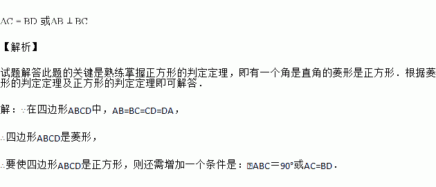 如图,在四边形ABCD中,,对角线AC与BD相交于点O,若不增加任何字母与辅助线,要使四边形ABCD是正方形,则还需增加一个条件是______.
