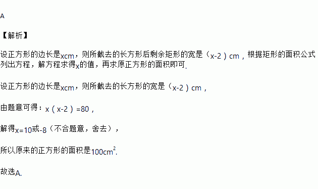 从正方形铁片上截去宽的一个长方形,剩余矩形的面积为,则原来正方形的面积为( )