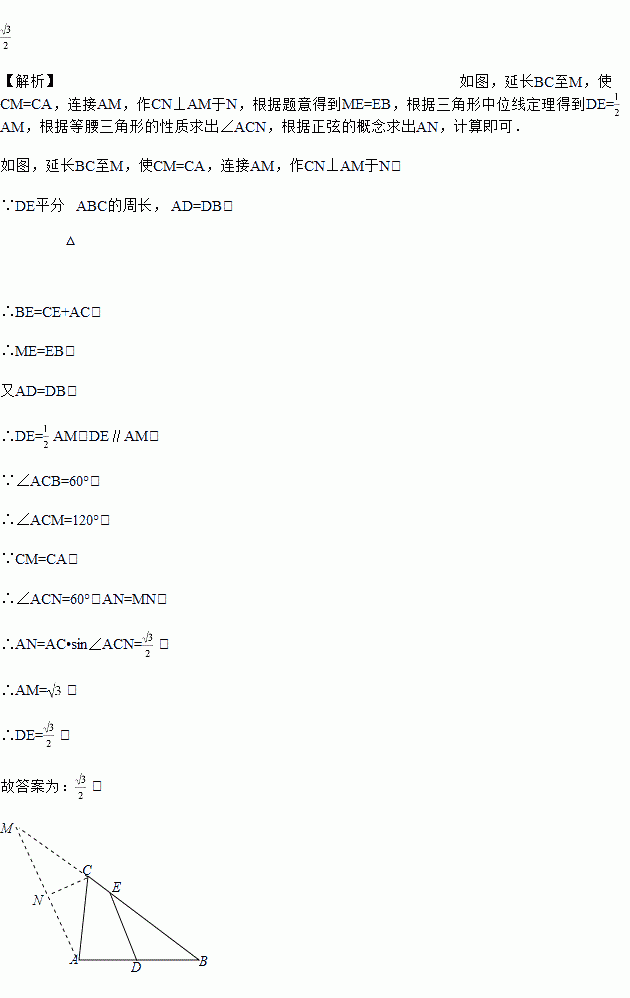 如图.在△ABC中,∠ACB=60°,AC=1,D是边AB的中点,E是边BC上一点.若DE平分△ABC的周长,则DE的长是_____.