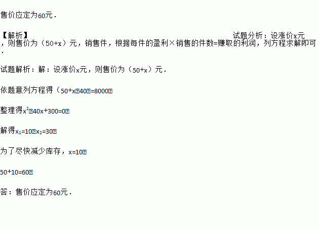 售价应定为60元. 【解析】试题分析:设涨价x元,则售价为(50+x)元,销售件,根据每件的盈利×销售的件数=赚取的利润,列方程求解即可. 试题解析:【解析】 设涨价x元,则售价为(50+x)元. 依题意列方程得(50+x﹣40)=8000. 整理得x2﹣40x+300=0, 解得x1=10,x2=30. 为了尽快减少库存,x=10, 50+10=60,...