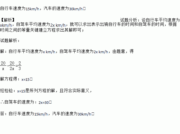 为了响应市政府“绿色出行”的号召,小张上下班由自驾车方式改为骑自行车方式. 已知小张单位与他家相距20千米,上下班高峰时段,自驾车的平均速度是自行车平均速度的2倍,骑自行车所用时间比自驾车所用时间多