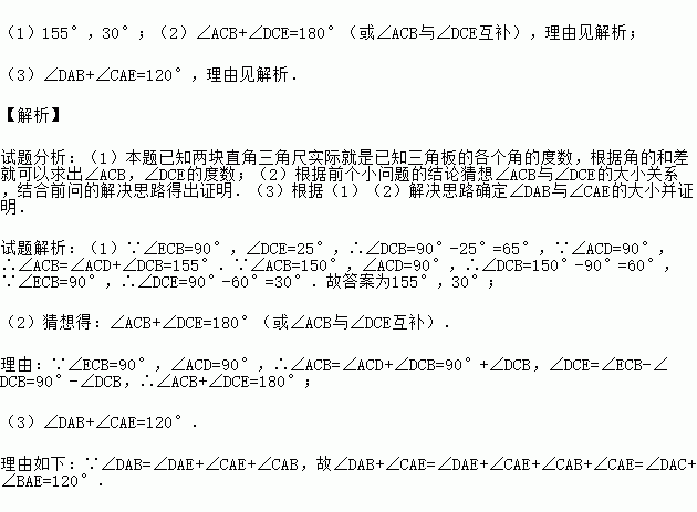 (3)如图(2),若是两个同样的直角三角尺60°锐角的顶点A重合在一起,则∠DAB与∠CAE的大小又有何关系,请说明理由.