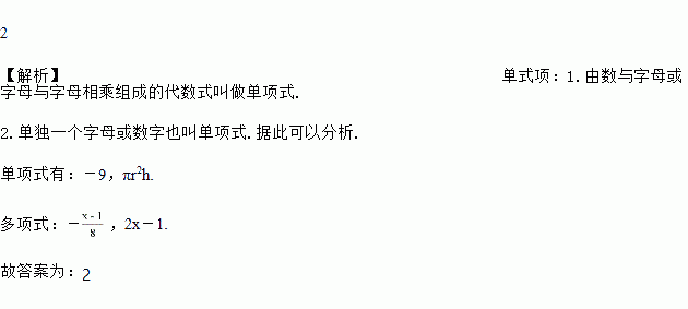 代数式-,-,2x-1,-9,πr2h中,单项式有________个.