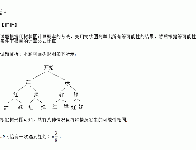 小明骑自行车从家去学校,途经装有红、绿灯的三个路口假设他在每个路口遇到红灯和绿灯的概率均为,则小明经过这三个路口时,恰有一次遇到红灯的概率是多少?请用树状图的方法加以说明.