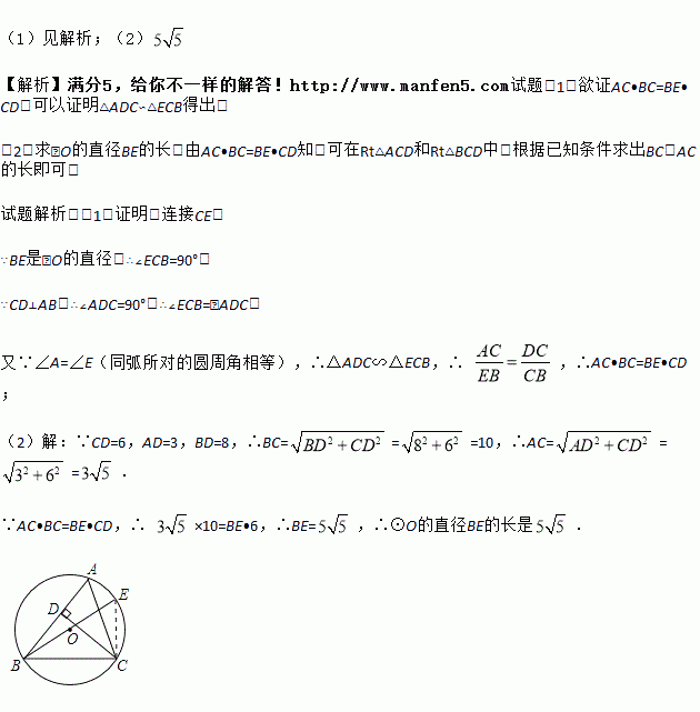 (2)已知CD=6、AD=3、BD=8,求⊙O的直径BE的长.