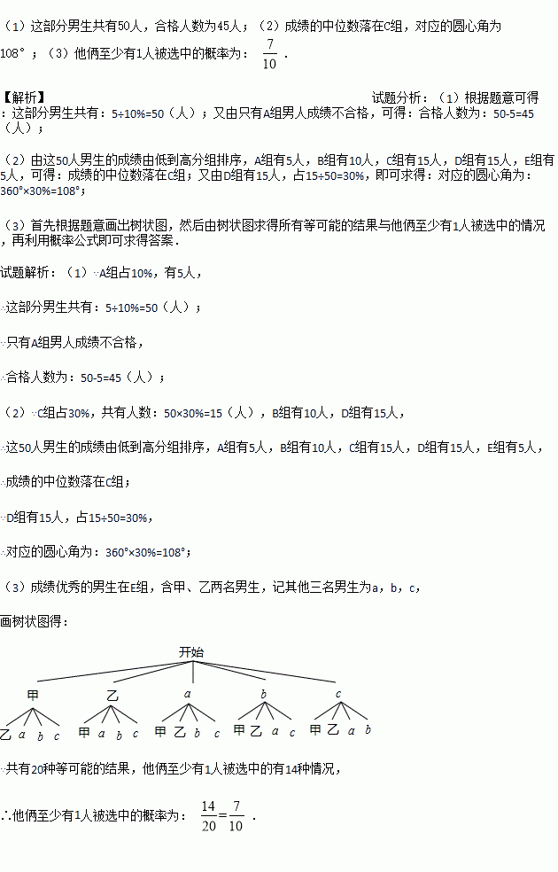 (2)这部分男生成绩的中位数落在哪一组?扇形统计图中D组对应的圆心角是多少度?