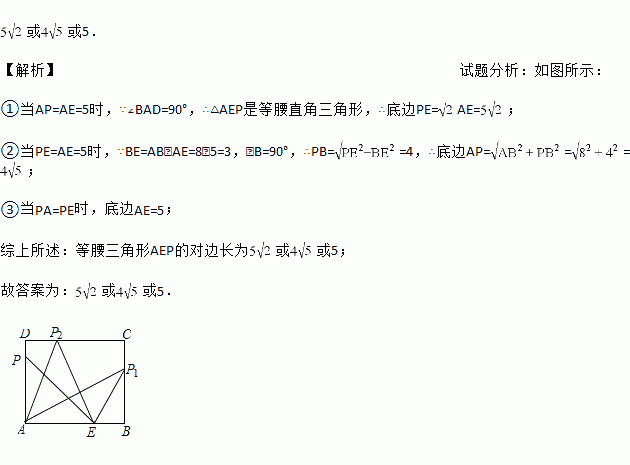 如图是一张长方形纸片ABCD,已知AB=8,AD=7,E为AB上一点,AE=5,现要剪下一张等腰三角形纸片(△AEP),使点P落在长方形ABCD的某一条边上,则等腰三角形AEP的底边长是 .