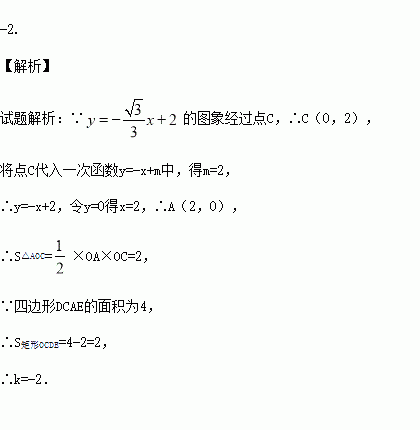 如图,D是反比例函数(k<0)的图象上一点,过D作DE⊥x轴于E,DC⊥y轴于C,一次函数y=-x+m与的图象都经过点C,与x轴分别交于A、B两点,四边形DCAE的面积为4,则k的值为 .