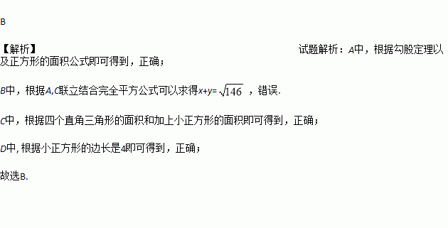 如图是用4个全等的直角三角形与1个小正方形镶嵌而成的正方形图案,已知大正方形面积为81,小正方形面积为16,若用x,y表示直角三角形的两直角边(x>y),请观察图案,指出以下关系式中不正确的是( )