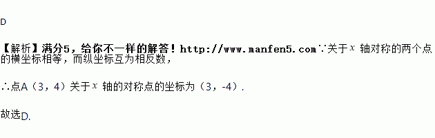 点A(3,4)关于x轴对称的点的坐标为( )