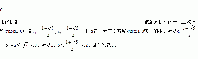 C 【解析】试题分析:解一元二次方程x2﹣x﹣1=0可得,因α是一元二次方程x2﹣x﹣1=0较大的根,所以α=;又因2<<3,所以1.5<<2,故答案选C.