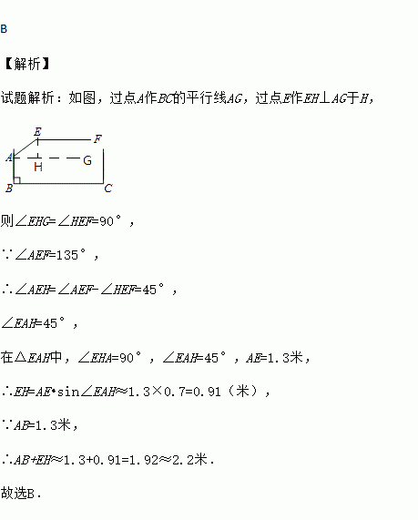 某地下车库出口处安装了“两段式栏杆”,点A是栏杆转动的支点,点E是栏杆两段的联结点.当车辆经过时,栏杆AEF最多只能升起到如图所示的位置,其中AB⊥BC,EF∥BC,∠AEF=135°,AB=AE=1.3米,那么适合该地下车库的车辆限高标志牌为(栏杆宽度忽略不计.参考数据: