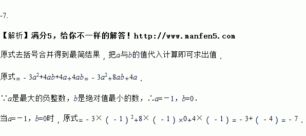 先化简,再求值:-(3a2-4ab)+2(2a+2ab),其中a是最大的负整数,b是绝对值最小的数.
