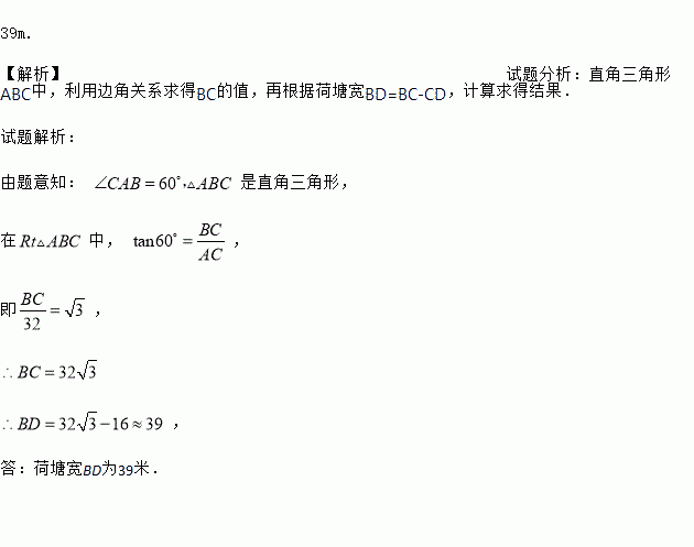 如图,某同学在楼房的A处测得荷塘的一端B处的俯角为,荷塘另一端D处与C、B在同一条直线上,已知32米, 16米,求荷塘宽BD为多少米? 取,结果保留整数