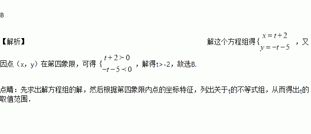 的解x、y分别作为某个点的横、纵坐标,得到一个点(x,y),若点(x,y)在第四象限,则t的取值范围是( )