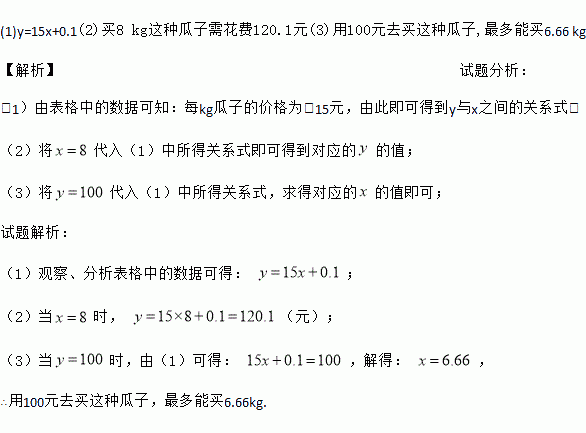 (1)y=15x+0.1(2)买8 kg这种瓜子需花费120.1元(3)用100元去买这种瓜子,最多能买6.66 kg 【解析】试题分析: (1)由表格中的数据可知:每kg瓜子的价格为:15元,由此即可得到y与x之间的关系式; (2)将代入(1)中所得关系式即可得到对应的的值; (3)将代入(1)中所得关系式,求得对应的的值即可; 试题解析: (1)观察、分析表...