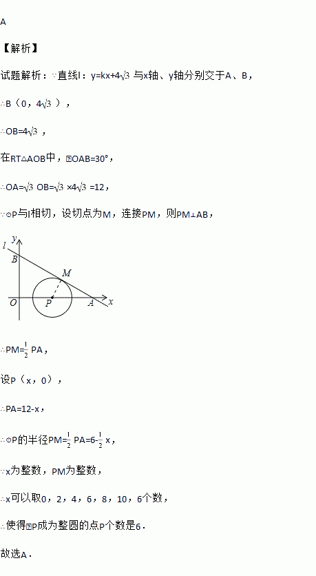 与x轴、y轴分别交于A、B,∠OAB=30°,点P在x轴上,⊙P与l相切,当P在线段OA上运动时,使得⊙P成为整圆的点P个数是( )