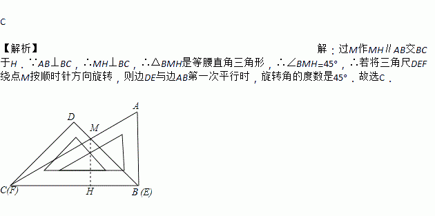 如图是一副三角尺ABC和与DEF拼成的图案,若将三角尺DEF绕点M按顺时针方向旋转,则边DE与边AB第一次平行时,旋转角的度数是( )