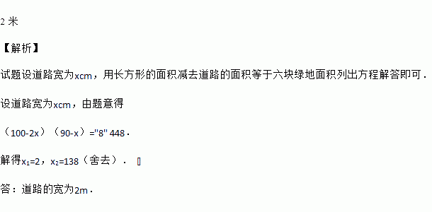 如图:要在长,宽的长方形绿地上修建宽度相同的道路,块绿地面积共,则道路的宽是________.