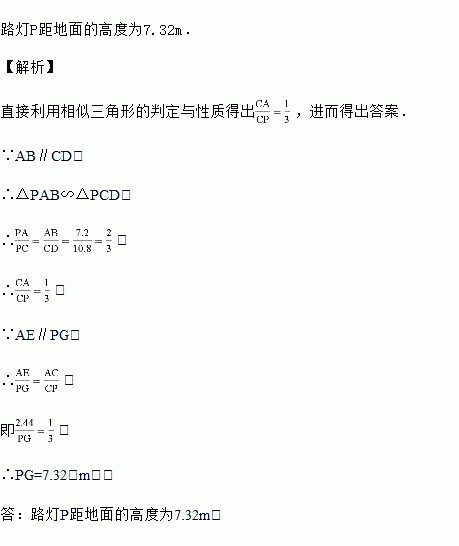 如图,足球场边有一路灯P,在灯下足球门横梁AB在地面上的影子为CD,经测量得知CD=10.8米,已知足球门横梁AB=7.2米,高AE=BF=2.44米,