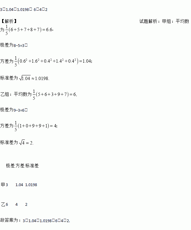 甲、乙两人进行投篮比赛,共进行了五次,每次每人投10个球.比赛结果投进个数分别为甲:6,5,7,8,7;乙:5,6,3,9,7.计算并将结果填入下表: