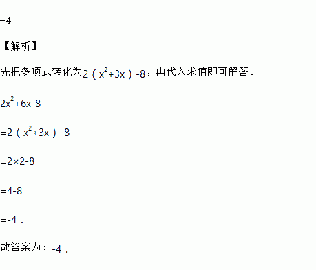 若x2+3x=2,那么多项式2x2+6x﹣8=________.