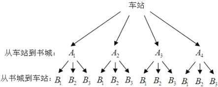 从车站到书城有A1,A2,A3,A4四条路线可走,从书城到广场有B1,B2,B3三条路线可走,现让你随机选择一条从车站出发经过书城到达广场的行走路线.