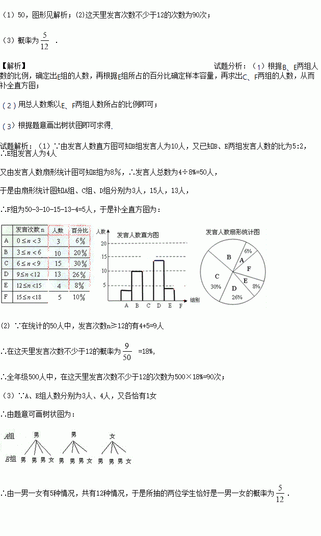 (3)已知A组发言的学生中恰有1位女生,E组发言的学生中有2位男生.现从A组与E组中分别抽一位学生写报告,请用列表法或画树状图的方法,求所抽的两位学生恰好是一男一女的概率.