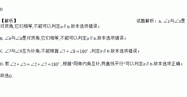 A. ∠1=∠3 B. ∠6=∠8 C. ∠7+∠8=180° D. ∠2+∠5=180°