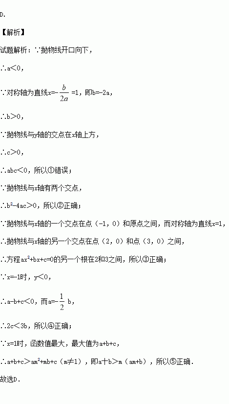 ①abc>0;②b2-4ac>0;③方程ax2+bx+c=0的另一个根在2和3之间;④2c<3b;⑤a十b>m(am+b),(m≠1的实数)