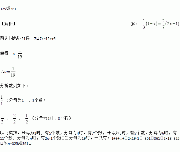 已知数列,记第一个数为a1,第二个数为a2,…,第n个数为an,若an是方程 (1-x)= (2x+1)的解,则n=___.